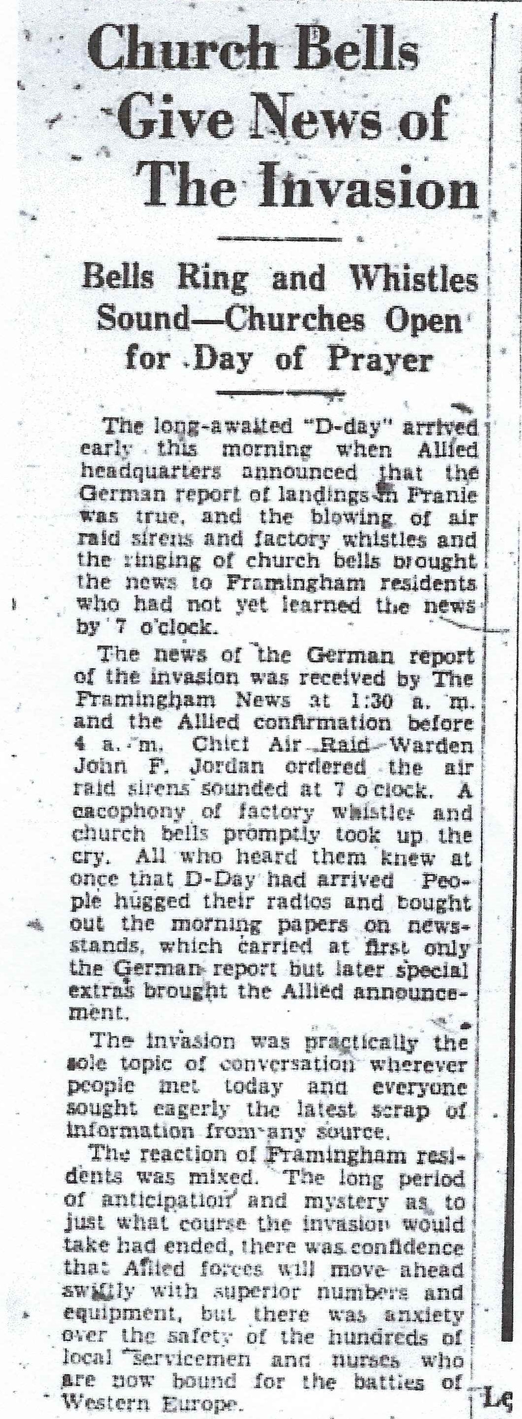 The long awaited D-Day was received by the people of Framingham in a spirit of prayer, rather than with celebration, as churches of all faiths held special invasion day services of prayer as requested by Gov. Leverett Saltonstall.