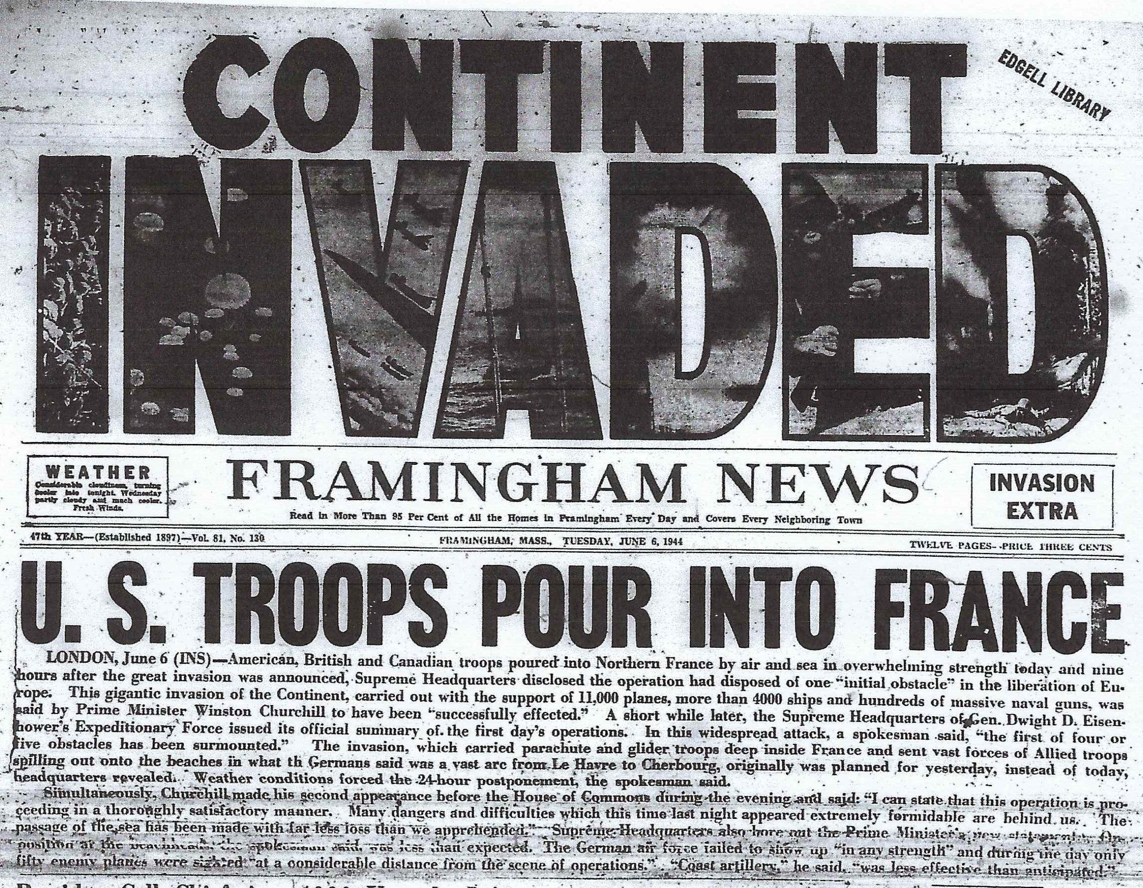 People gathered around their radios for any news. The local paper, emblazoned with the headline “CONTINENT INVADED, U.S. TROOPS POUR INTO FRANCE,” were soon sold out at every news stand in town. Flags were set up along the major streets. Businesses closed for the day. The following quote from the Framingham News, June 7, sums up the town’s response to the news.