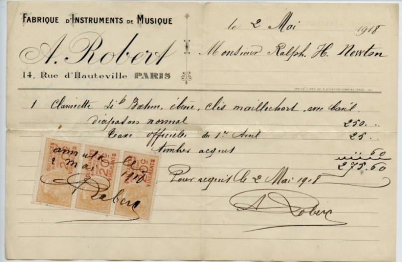 *About that clarinet – another surprise: This was not Ralph Newton’s first purchase from A. Robert. In 1914, he purchased two clarinets from France – also from A. Robert – and had them shipped to Framingham. These clarinets he played throughout his life (see photo p.2). Nearly 100 years later, his great-grandson played them in his school orchestra.