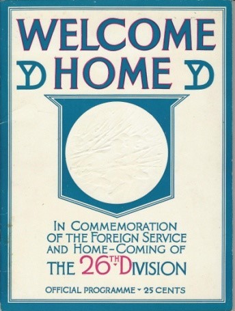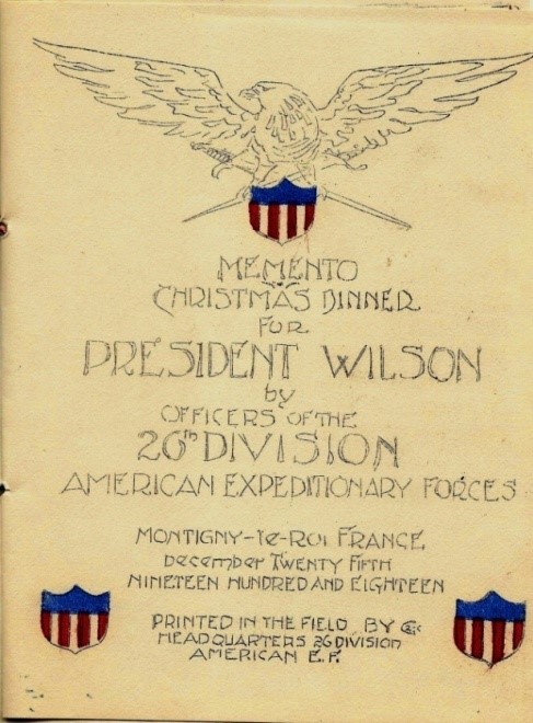 On Christmas Day, 1919, President Wilson and General Pershing visited and had dinner with the 26th Yankee Division in Montigny le Roi, France. My grandfather saved an original 1919 Christmas Program from that day (excerpts below). In color and “Printed in the field by Headquarters 26th Division American EF,” it shows just how significant an occasion it was.