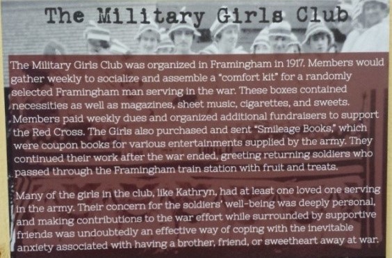 each week, sent care packages to selected Framingham soldiers. Soldiers’ thank you notes were published in the newspaper and fortunately, the group’s president (Cassie Harrington) kept a scrapbook. That very scrapbook is on display at FHC, lent by Kathy Barbieri Tomasetti, Cassie’s granddaughter.