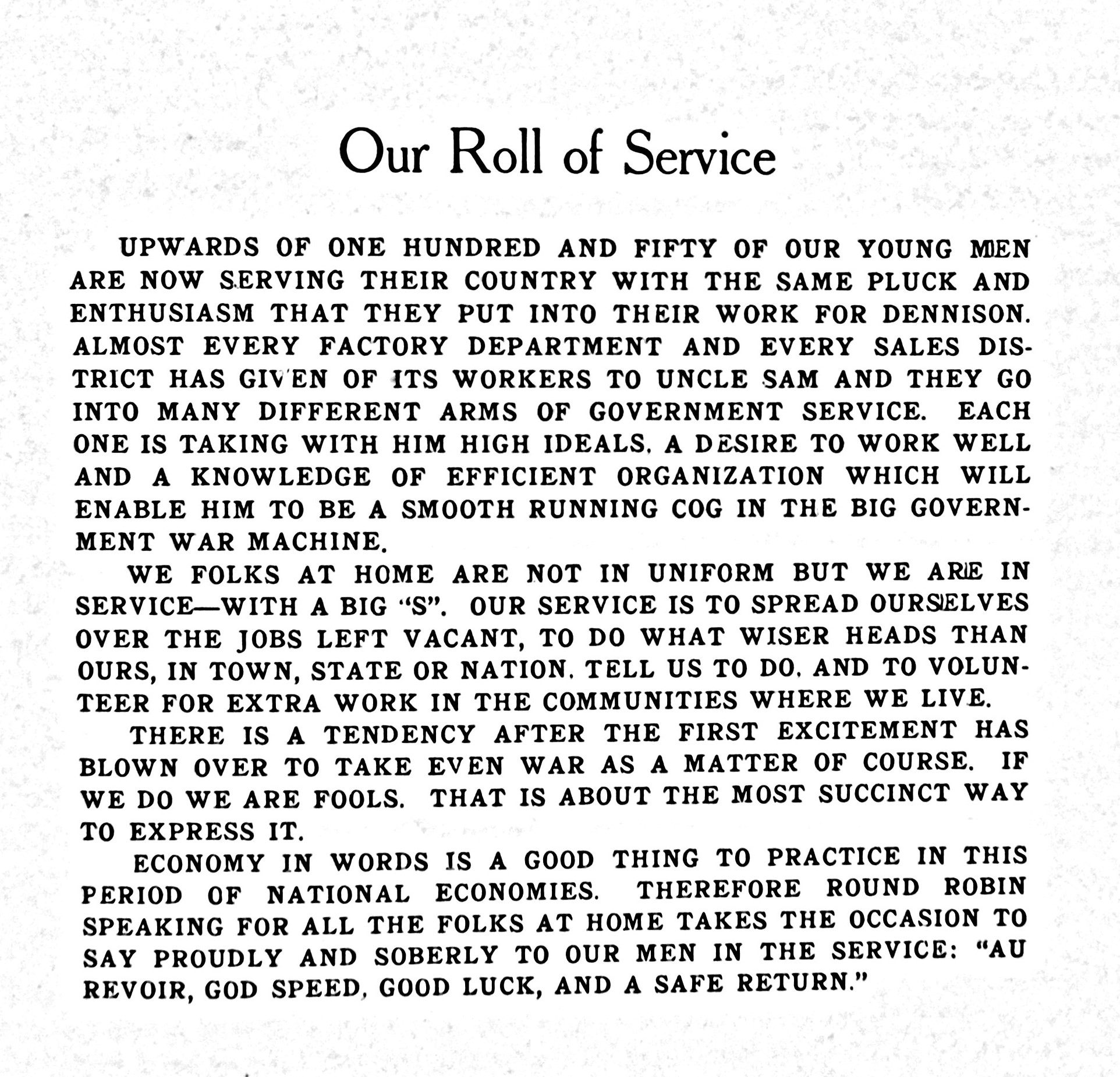 “upwards of 150 our young men are now serving their country with the same pluck and enthusiasm that they put into their work for Dennison.”