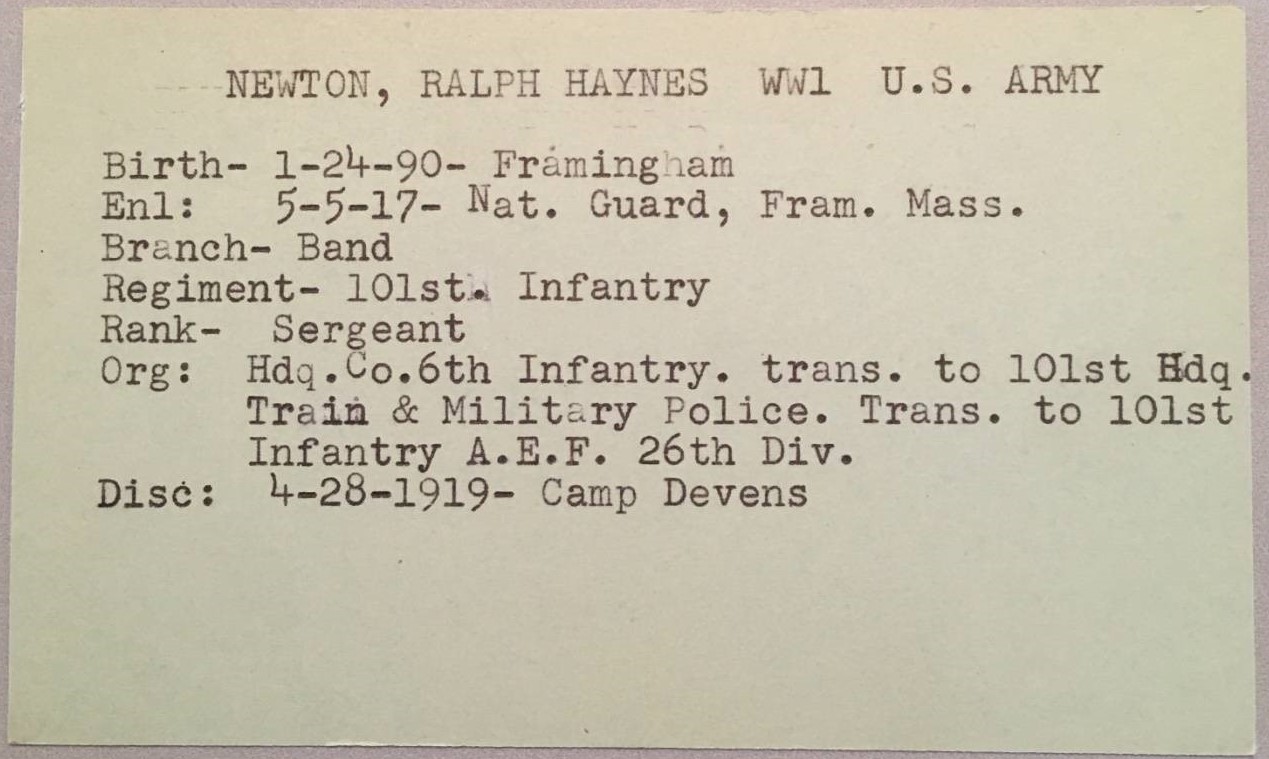 Once the U.S. declared war on Germany, Ralph Newton made the decision to enlist and in May 1917, he joined his local National Guard unit, the 6th Mass Infantry, at Framingham.