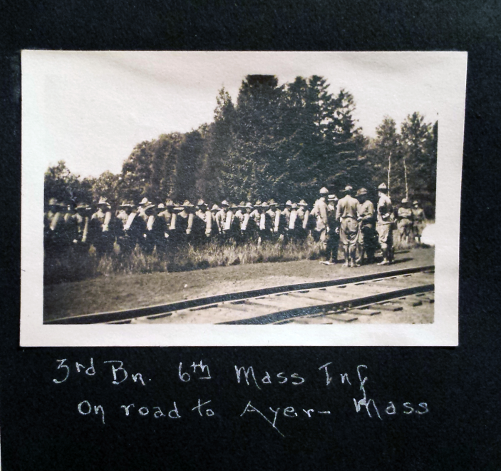 Far Left: 3rd Battalion 6th Mass Infantry on the road to Ayer, Ma. Another photo, not shown, notes “32 miles to Devens.”