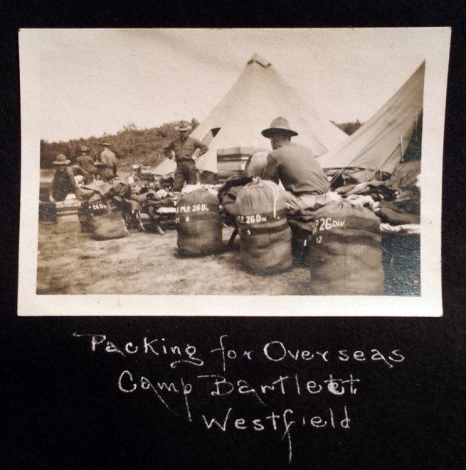 Left: Packing for Overseas, Camp Bartlett Westfield. The 26th Yankee Division was newly formed when this was taken. Note the 26th Div on the duffle bags.